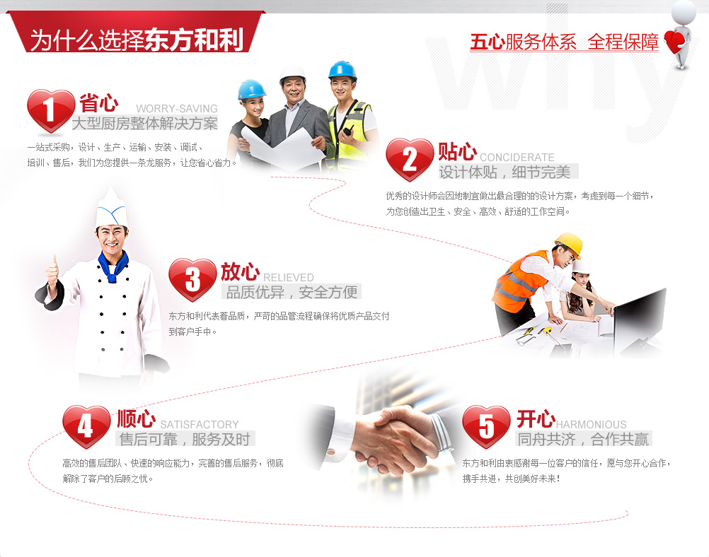 廚房工程建設(shè)是一項(xiàng)龐大復(fù)雜的系統(tǒng)工程,既需要與后勤工作人員、廚師溝通協(xié)調(diào), 又要與土建、裝修、機(jī)電、暖通等工程人員相互配合,工作量十分巨大。同時還要采購眾多的食品機(jī)械、工具,這對沒有相關(guān)經(jīng)驗(yàn)的我們來說確實(shí)是一個挑戰(zhàn)。有時候我們面對廚師提出的長長的采購需求清單就已經(jīng)眼花繚亂了。 幸好東方和利提供的是整體解決方案,從前期的設(shè)計咨詢到后期的安裝調(diào)試、從大型設(shè)備到餐具小件,包括各種食品機(jī)械,排煙通風(fēng),這些瑣碎事情都由東方和利來完成,為我們提供量身定制的解決方案。一站式采購為我們節(jié)省了大量精力,而且所有廚具都由東方和利來保修,對我們來說也更加方便。總之,東方和利的服務(wù)讓我們非常省心,我很滿意。